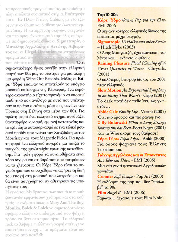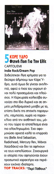 "Στους Κόρε Ύδρο αντίθετα αυτό που ξεχωρίζει πρωτίστως είναι ο έντονος, κοφτερός και βαθιά ελληνικός λόγος τους. Συνδυασμένος όμως με μια μουσική άψογα παιγμένη, αλλά εντελώς αδύνατο να περιγραφεί και μια φωνή ανάμεσα στην τραγικότητα και τον σαρκασμό, οι Κόρε Ύδρο είναι το πιο παράξενα γοητευτικό συγκρότημα της δεκαετίας. Το Φτηνή Ποπ Για Την Ελίτ βρέθηκε στην 4η θέση, ως ο δίσκος που τους έκανε ευρύτερα γνωστούς. Μια πραγματική αποκάλυψη!"