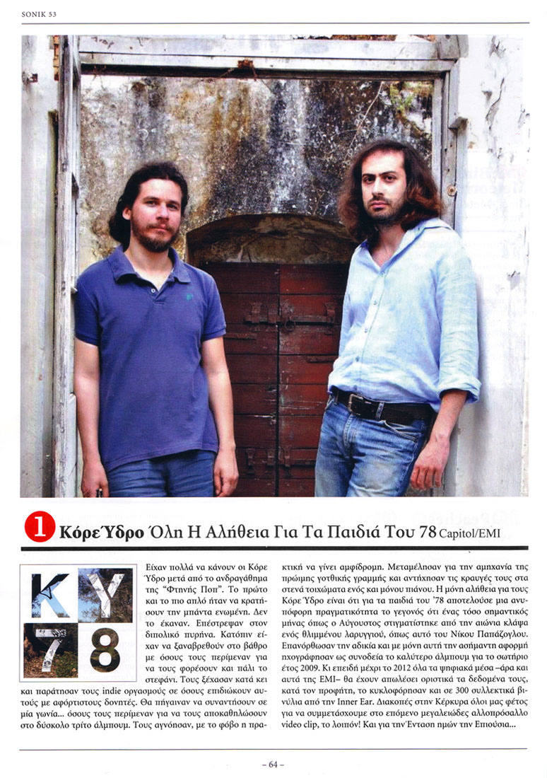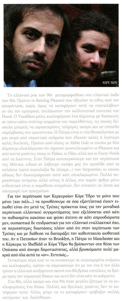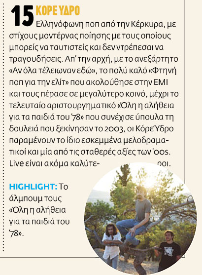 "Απ' την αρχή, με το ανεξάρτητο «Αν όλα τέλειωναν εδώ», το πολύ καλό «Φτηνή ποπ για την ελίτ» που ακολούθησε στην ΕΜΙ και τους πέρασε σε μεγαλύτερο κοινό, μέχρι το τελευταίο αριστουργηματικό «Όλη η αλήθεια για τα παιδιά του '78» που συνέχισε ύπουλα τη δουλειά που ξεκίνησαν το 2003, οι Κόρε Ύδρο παραμένουν το ίδιο εσκεμμένα μελοδραματικοί και μία από τις σταθερές αξίες των '00s."
