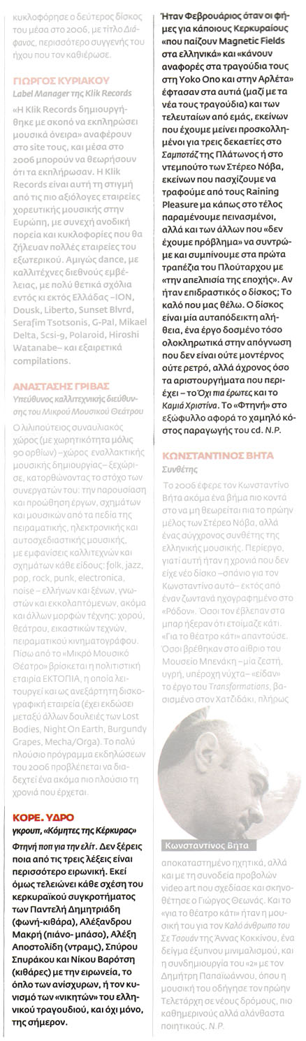 "Μοναχική περίπτωση από την περιφερειακή Κέρκυρα, οι Κόρε Ύδρο υπήρξαν μεν παιδιά της εποχής τους - όσον αφορά στο φλερτ με τον εναλλακτικό αγγλοσαξονικό ήχο - προχώρησαν όμως περισσότερο από κάθε άλλον συνοδοιπόρο τους, καθώς τους απασχόλησε η επιτυχής ένταξη του ελληνικού στίχου στο περιβάλλον αυτό. Η τέταρτη θέση της ψηφοφορίας ήρθε να επισφραγίσει πανηγυρικά το τόλμημά τους." [Αλέξης Βούκαλης]