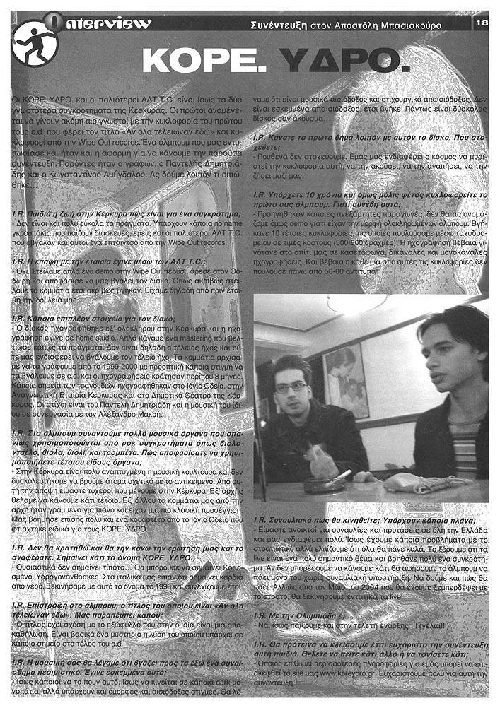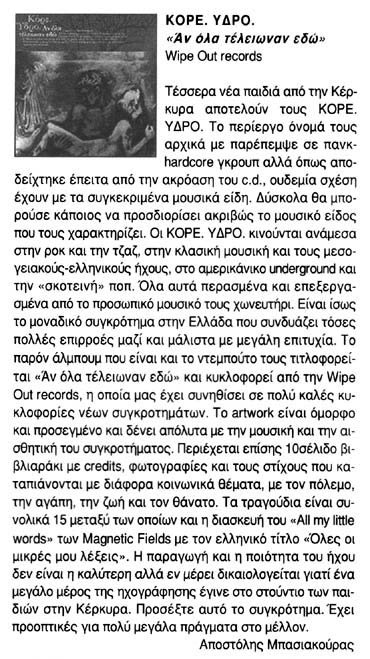 Διαβάστε στο τρέχον τεύχος (Αύγουστος 2003) του περιοδικού ROCK+ROLL το άρθρο για τους Κόρε. Ύδρο. και τη νέα, εμπλουτισμένη κριτική του Αν Όλα Τέλειωναν Εδώ που το συνοδεύει. [μετάβαση στις ΚΡΙΤΙΚΕΣ]