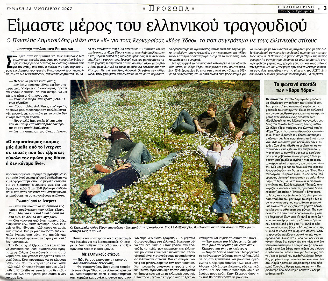 Το ένθετο Τέχνες και Γράμματα της ΚΑΘΗΜΕΡΙΝΗΣ της προηγούμενης Κυριακής (28.01.2007) δημοσίευσε φρεσκότατη super-«straight» συνέντευξη του Π.Ε. Δημητριάδη, που για πρώτη φορά παραδέχεται την «έντεχνη» διάσταση των Κόρε. Ύδρο. (η λέξη βέβαια σε παραγλωσσικό context που δε δηλώνεται στο δημοσιευθέν κείμενο) αλλά και ότι επιδιώκει να γίνει καθηγητής (μόνο) για τα λεφτά. Διαβάστε τη συνέντευξη εδώ.