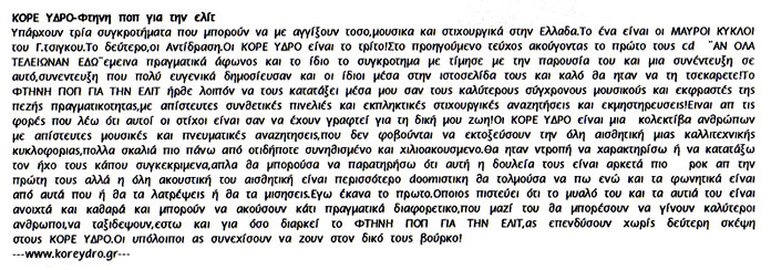 Διαβάστε επίσης την κοινή συνέντευξη που είχαν δώσει οι Κόρε. Ύδρο. με τα άλλα δύο συγκροτήματα του GAGARIN λίγες μέρες πριν τη συναυλία στον Θάνο Σταυριανάκη για το (επίσης σαλονικιώτικο) MiC. [Μας είχαν στείλει και από το Avopolis τη μέρα της συναυλίας, αλλά δεν προλάβαμε να απαντήσουμε, με την ψυχή στο στόμα πήγαμε και στο σταθμό του ΣΥΝΑΣΠΙΣΜΟΥ...]
