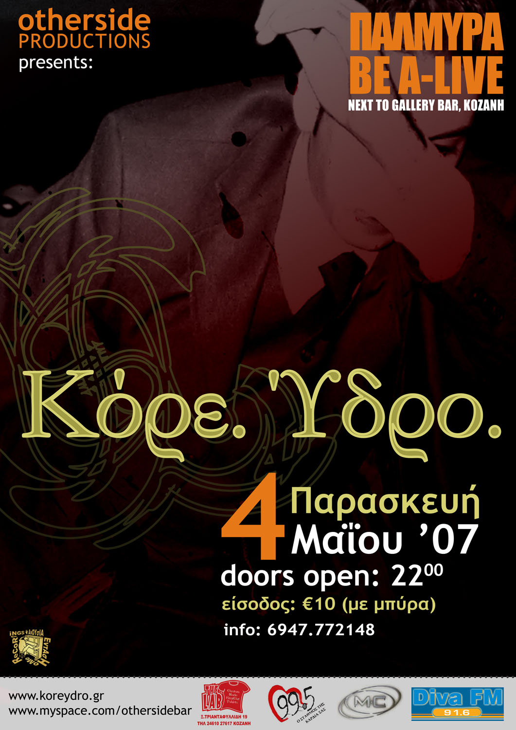 ![Gagarin 205, 15.02.07 [photo by Georgia Regi]](../photos/live/Gagarin2/Georgia/Gag07Geor01t.jpg) Κάτω από τη σκιά των πρόσφατων αποκαλύψεων περί της ετεροθαλούς γονεϊκής σχέσης του Π.Ε. Δημητριάδη με τον Αλέξανδρο Μακρή, θα πραγματοποιηθεί από τις 3 έως τις 8 Μαΐου η πρώτη «περιοδεία» στη δεκατριάχρονη ιστορία των Κόρε. Ύδρο., με πυρήνες τις τρεις μεγαλύτερες ελληνικές πόλεις και κατάληξη «την πρωτεύουσα της Ελλάδας, την Αθήνα» (Γιώργος Μίνος, Αθλητική Κυριακή 15.04.07).